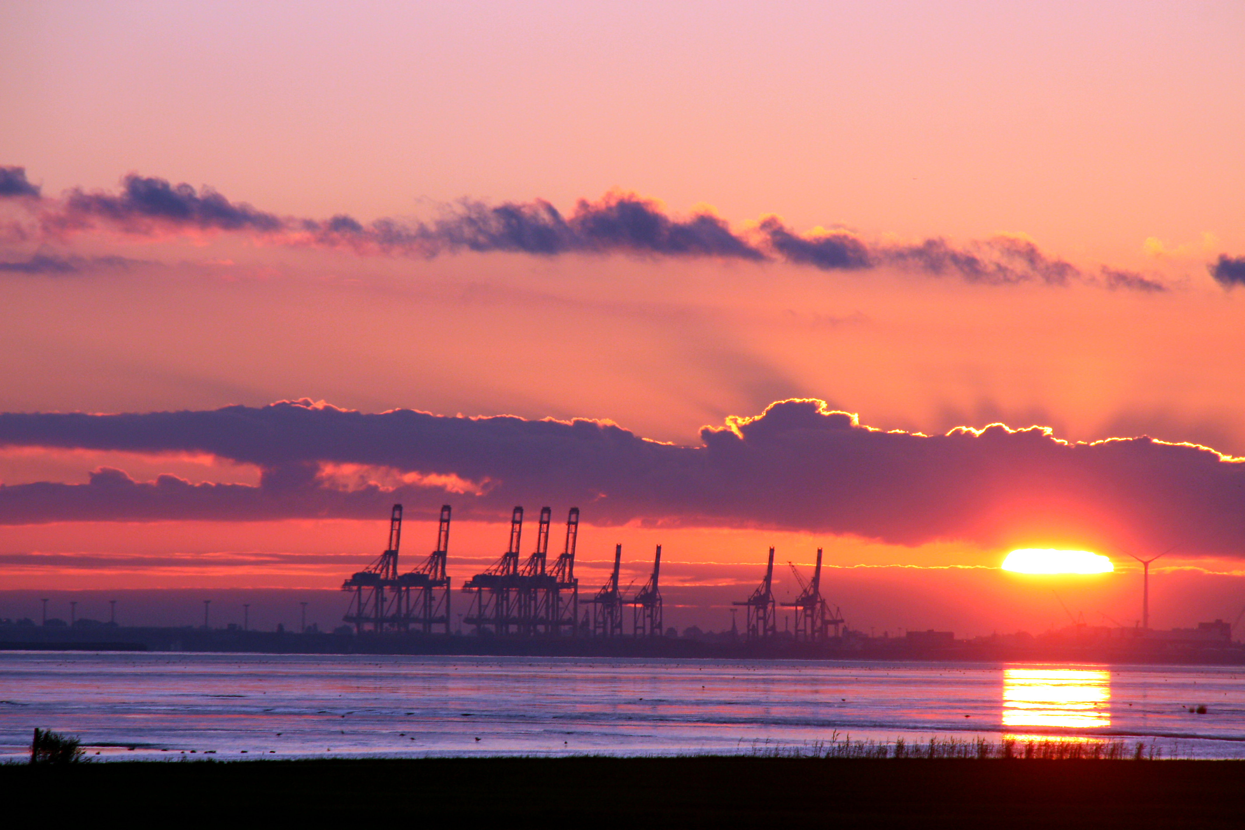 Butjadingen blickt bei Sonnenaufgang über die Weser zum Containerterminal in Bremerhaven
