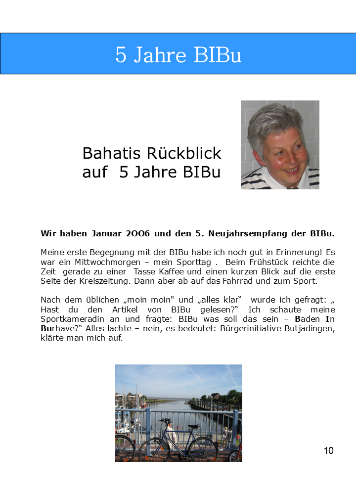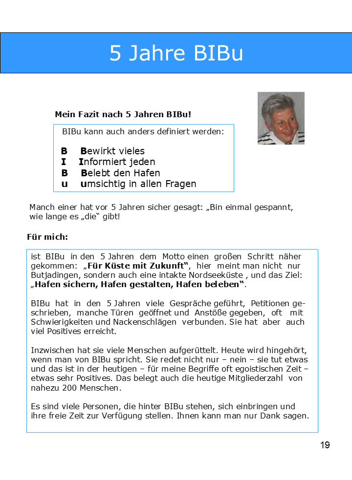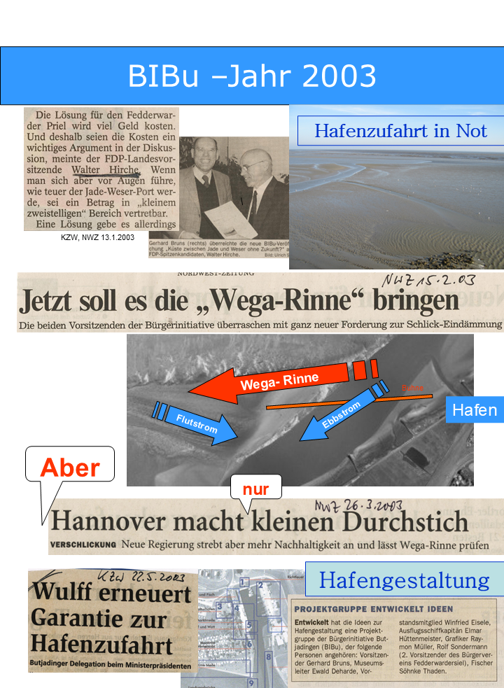 Die Bürgerinitiative hat sich 2008 aufgelöst. Die Domäne "www.buergerinitiative-butjadingen.de",(BiBu), wurde gelöscht. Auf dieser Webseite findet man noch die wichtigsten Informationen über BiBu, über ihren verlorenen Kampf, die ständig zunehmende Verschlickung der Hafenzufahrt und des Hafens zu verhindern. Dennoch hat BiBu sehr viel erreicht, das Hafenumfeld attraktiv zu gestalten.