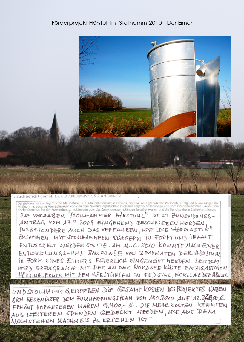 Darüberhinaus wurde mit der Einweihung des Plattfisches im Jahre 2008 die Idee gebohren, noch einen weiteren Höstuhl in Eckwarderhörne zu erstellen. Als 1. Vorsitzendner der sich 2008 auflösenden Bürgerinitiative Butjadingen gelang es mir, aus den Restmitteln von BiBu als Einlage einen Förderantrag bei der Landesregierung Niedersachen einzureichen, um einen weiteren Hörstuhl in Eckwarderhörne zu finanzieren und erstellen zu können.