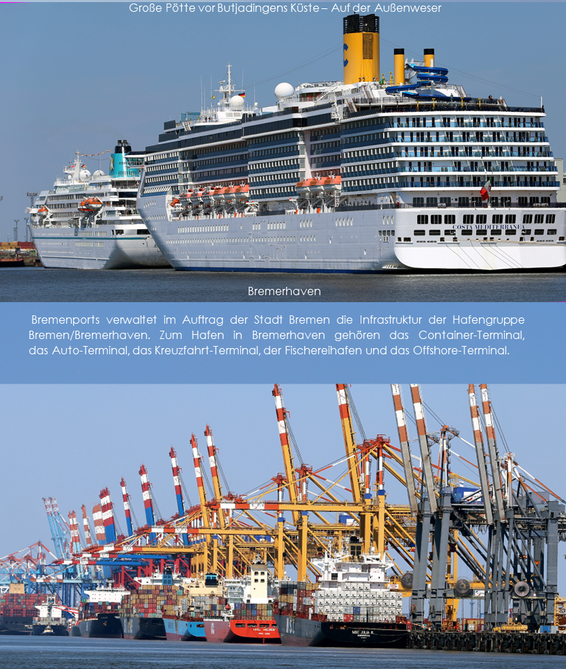 Das Wort STROM-Kaje, worauf Bremerhaven so stolz ist allerdings eines der größten Probleme, das Bremen-Ports an der südlichen Nordsee zwischen Jade und Weser verursacht. Das Wort "STROM" - meint den Fluß Weser. Und die Weser wurde für immer größere Pötte, Containerschiffe, vertieft. Bremerhaven und Hamburg, im Binnenland gelegen, verursachen nicht nur Schäden in den Flüssen und an den Flußlanschaften, sondern an der gesamtem Südlichen Nordsee.