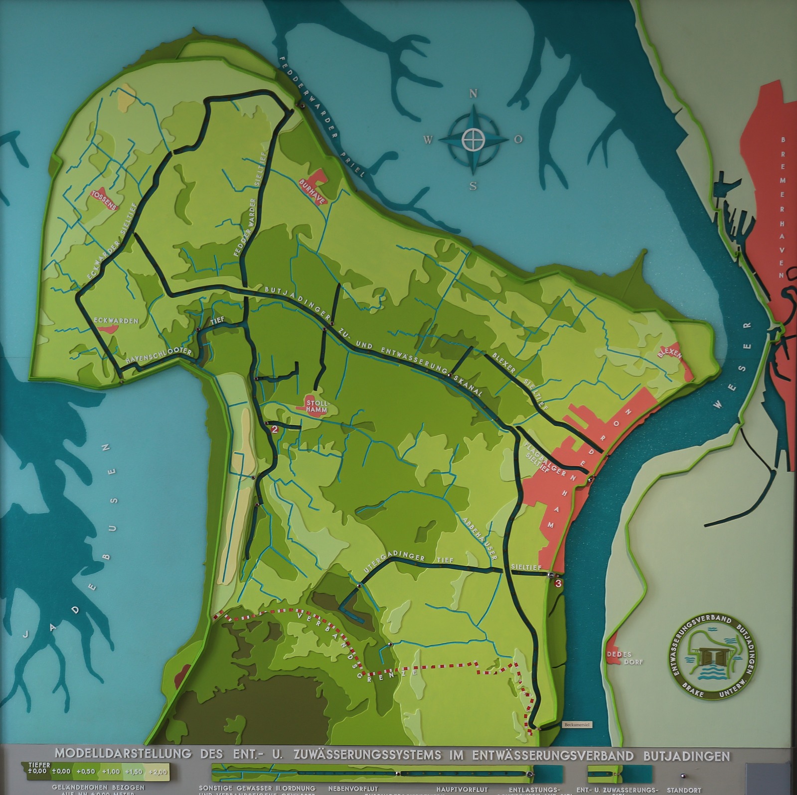 Große Gebiete von Butjadingen liegen vielfach unter NN. Wenn es keine Deiche gäbe und kein umfassendes Entwässerungssystem aus Gräben, Sielen und Kanälen, dann würden weite Teile von Butjadingen bei einem Tidenhub von 3 Metern zweimal am Tag überschwemmt werden. Bei Sturmfluten und Deichbruch würden die Wassermassen fast Oldenburg erreichen.