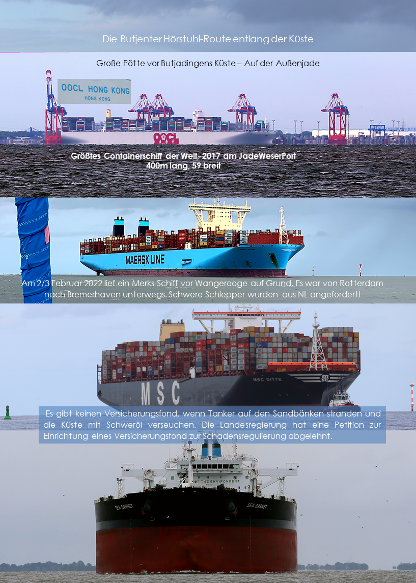 Die Tanker und Conainerschiffe bedrohen bei Haverien, die gesamte südliche Nordsee zu verseuchen. Die Petition der Bürgerinitiative einen Versicherungsfond für solche Katastrophen einzurichten, um damit die wichtigen Arbeitsplätze der " Weißen Industrie" an der Küste zu erhalten, fiel bei der Landesregierung auf taube Ohren. Lieber verbietet man in Hannover das Segeln im Wattenmeer. So geht Umweltschutz in Niedersachsen!
