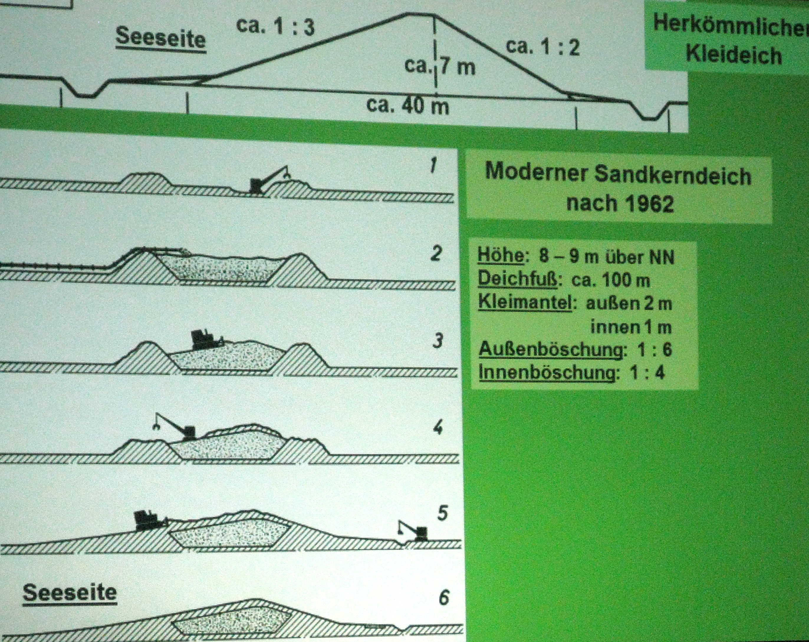 Wegen der Sturmflut 1962, den besonderen Schäden gerade auf der Landseite des Deiches, wurden in Deutschland die Deichprofile anders konstruiert. Die Deiche hatten bisher zur Lanseite ein zu steiles Profil. Die Brecher der aufgwühlten Nordsee, überrollten den Deich und verursachten wegen der steilen Seite des Deiches auf der Landseite große Löcher. Die Deiche drohten-wie die Fotos es zeigen- von der Landseite zu brechen.
